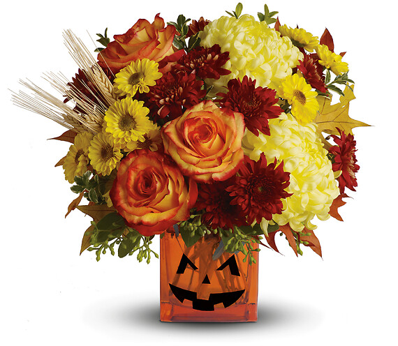 Happy Yellow-een! Yellow chrysanthemums are accented with bright orange roses -all finished with eucalyptus and autumn oak leaves. In an orange cube vase with a jack-o-lantern face, this is one bright and frightening boo-quet!